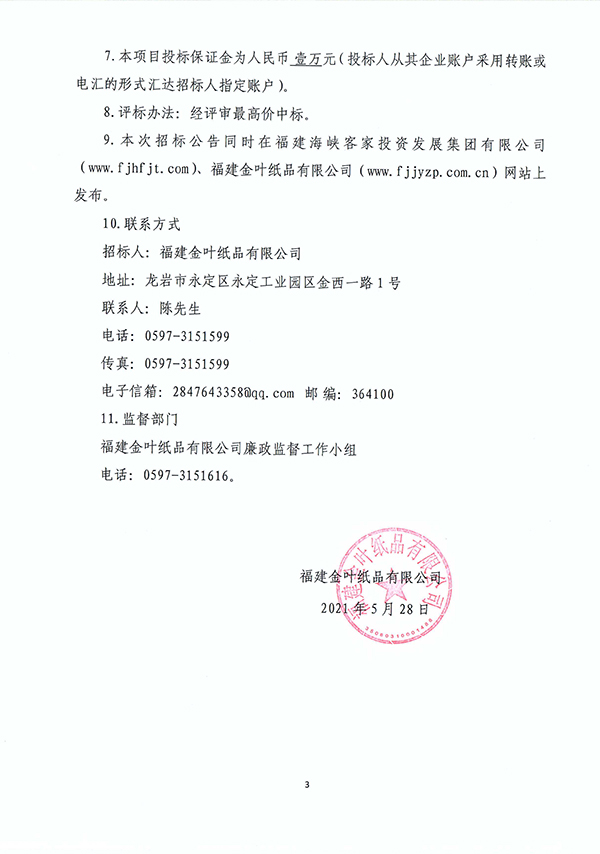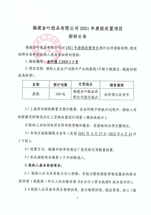 福建金葉紙品有限公司2021年廢紙處置項目招標公告