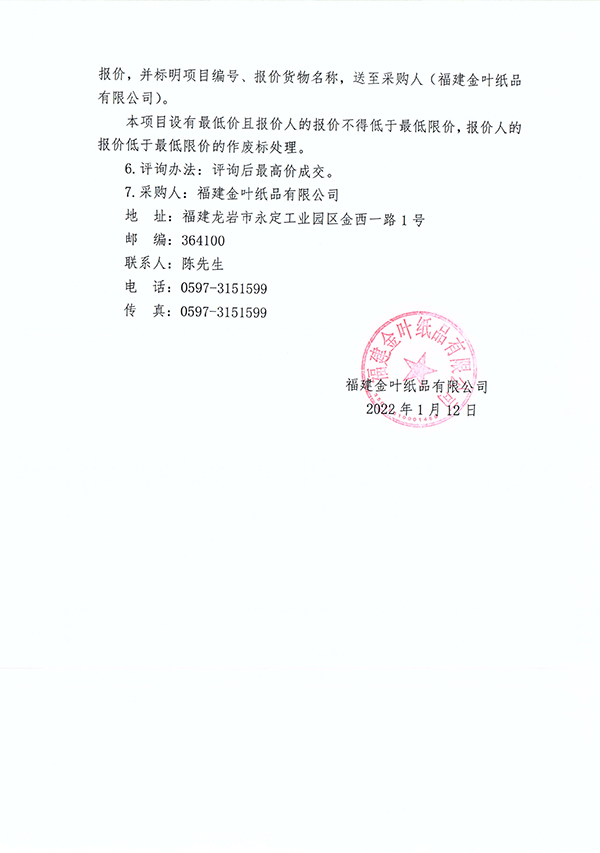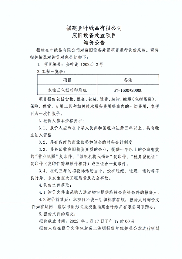 福建金葉紙品有限公司廢舊設(shè)備處置項(xiàng)目詢價(jià)公告
